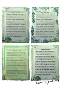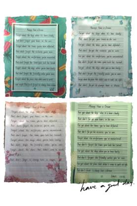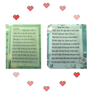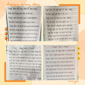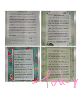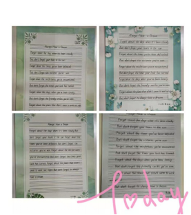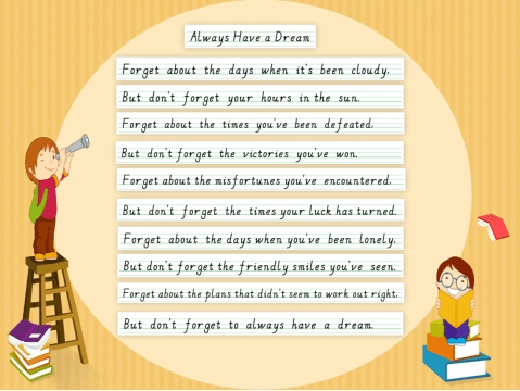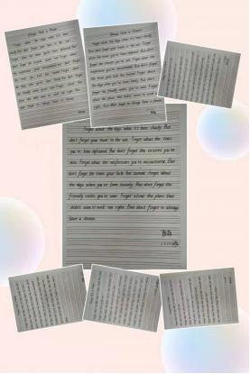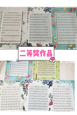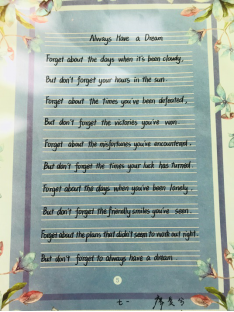 经过英语组老师们的精心挑选,本次比赛的参赛内容为英文短诗歌《Always Have a Dream》学生要在二十分钟的时间内将诗歌内容整洁优美地誊写在书写纸上。并且要求书写规范,单词、句子书写符合格式及手写体要求;卷面要整洁,字体要美观大方,间距适中,标点符号要书写正确,无错字、别字,无明显涂改。