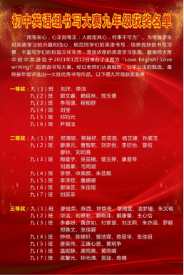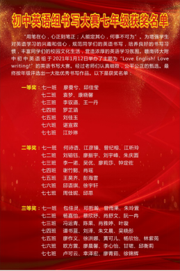 “用笔在心,心正则笔正;人能定其心,何事不可为”。为增强学生对英语学习的兴趣和信心,规范同学们的英语书写,培养良好的书写习惯,丰富同学们的校园文化生活,营造浓厚的英语学习氛围。赣南师大附中初中英语组于2021年1月12日举办了主题为“Love English! Love writing!”的英语书写大赛。初中各年级学生都在各班教室参加了此次比赛。