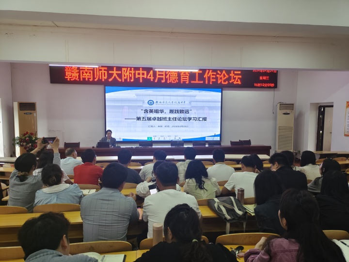 为深入贯彻落实“生本德育”理念,增强我校德育工作实效,进一步加强德育工作队伍建设,推动构建“全员参与”的德育工作体系,4月24日下午,我校在科技楼多功能厅召开“4月德育工作论坛”。各年级年级组长、副组长和全体班主任参加,论坛由学工处主任葛贻生主持。