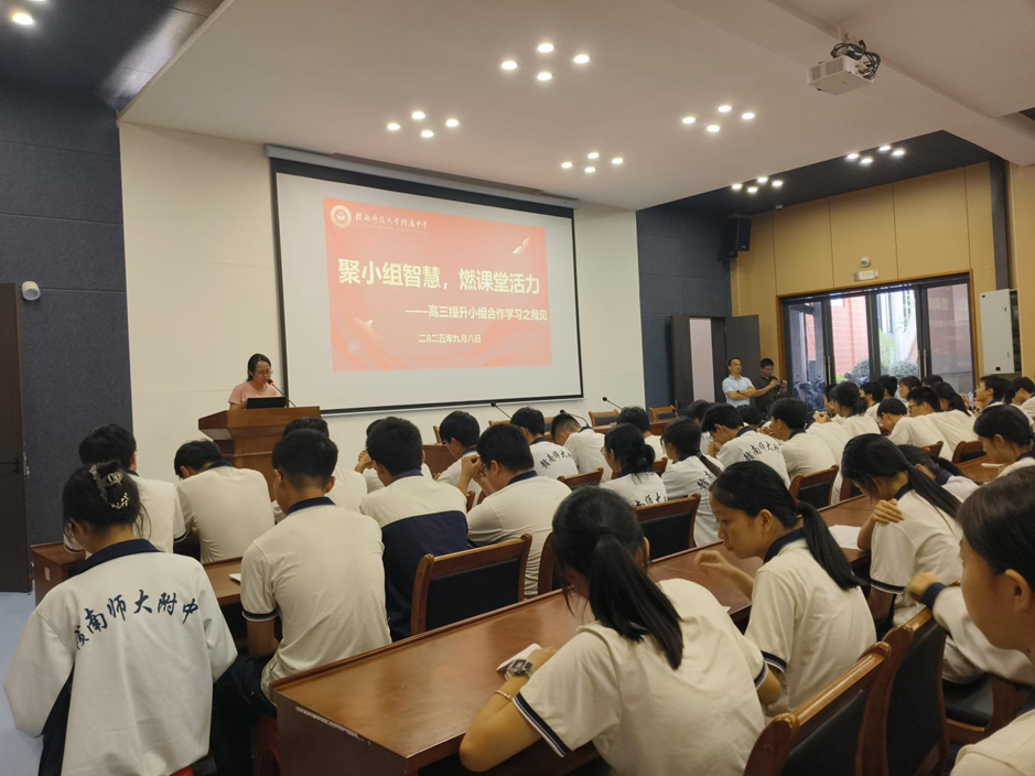 为深度推进“智慧课堂 5+2 教学模式”改革,破解课堂参与度不足难题,激发学生主动学习的内驱力,9 月 8 日下午 16:00,我校高三年级在合班教室隆重召开 “聚小组智慧,燃课堂活力——提升小组合作学习力之我见”专题会议。会议由江雯老师主持,全体高三师生参会,汪校长莅临指导并讲话。