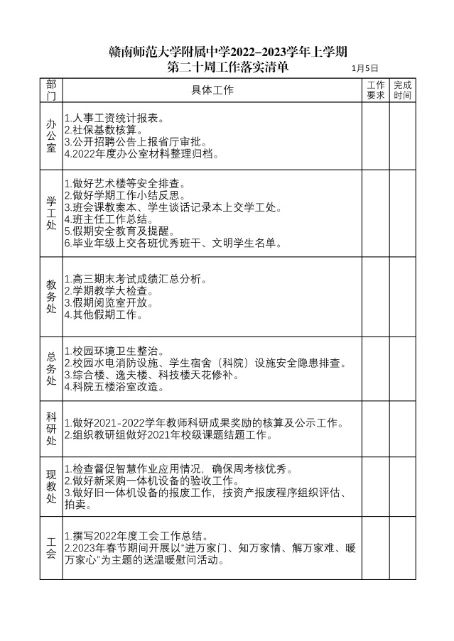 赣南师范大学附属中学2022年秋第二十周工作落实清单
